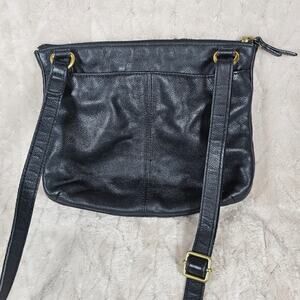 Beautiful pebbled black leather crossbody purse with an adjustable strap. Has a zippered pocket on the front, and an open pocket on the back. Zippered closure. One zippered pocked on the inside of the bag. Leather is in excellent pre owned condition, inner fabric lining has some marks and discoloration. See photos for full details. 9x10 inches.