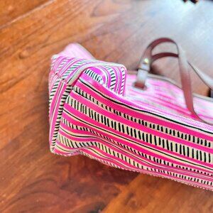 Stylish pink striped tote bag featuring leather straps, a key charm, and a spacious interior with multiple pockets. Ideal for everyday use.