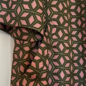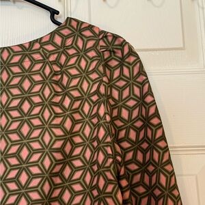 Chic mini dress with geometric design. Features pink and green hues. Ideal for casual wear.