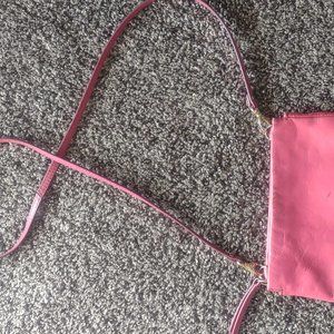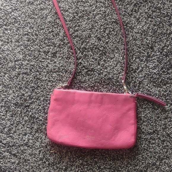 Fossil "Mini Piper" women's pink leather crossbody bag is compact, yet surprisingly spacious. Has a removable pink leather with swivel hooks strap, gold-tone hardware, and top zip closure. Interior has 3 card slots. Fabric shows wear and tear and some discoloration that could be cleaned by someone who knows how. Otherwise in great shape (no tears, zipper works, etc.)