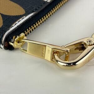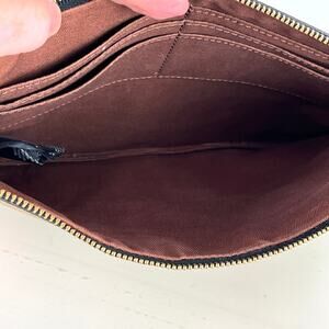 Clutch with leather wrist band, zip closure and interior card pockets. Measure approx 10" x 7.5"
