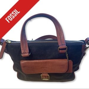 Black leather with Tan trim Fossil Purse with a pocket on the front that will fit a phone or lip sticks, etc. It also has three pockets on the inside, one that zips.