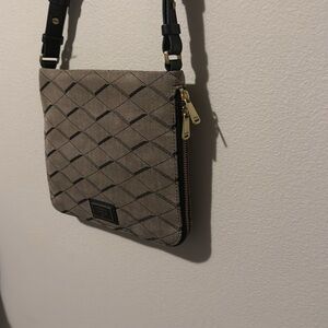 This is the Preston Canvas Fossil Crossbody Purse with expandable zipper sides with black leather and adjustable straps. Zippers are in great condition and so is the purse. No stains or spots. One pocket on the inside with a zipper closure as well and one pocket on the pack that zips closed. Body of the purse measures about 8 by 9 inches when it’s closed up.