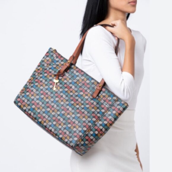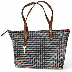 Fossil "Rachel" Large Tote Bag, PVC Outer Multicolor Pattern Key Charm Pockets