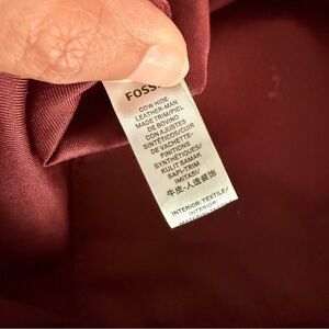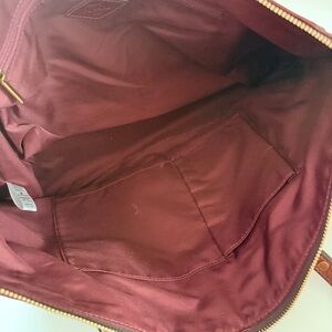 Classic Fossil Rachel tote crafted from rich wine red leather with tan leather shoulder straps and signature key charm. Features a zip-top closure, front slip pocket, and spacious interior perfect for work, school, or everyday use. Chic, practical, and timeless.