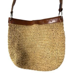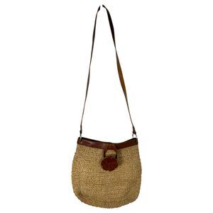 Fossil Raffia Straw Woven Brown Leather Floral Details Crossbody Purse Handbag Bag