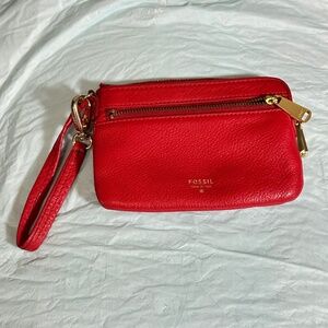 Fossil, red leather woman’s wristlet wallet. Gold tone hardware. Gold tone “Fossil” stamp in front at bottom. Front has zipper pouch. Zipper pulls engraved with “Fossil”. Inside pouch has three credit card slots. Interior fabric is brown. Extremely soft. Excellent condition. Has two small marks at top on back near Crossbody attachment & one small mark opposite corner, bottom, on back. Has a loop where you can attach Crossbody on back & at wristlet. Wristlet clip says “Fossil“.