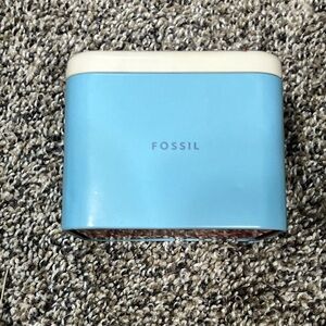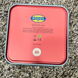 Fossil tin with a retro car design. Features vibrant red and blue colors. Case only empty inside