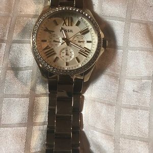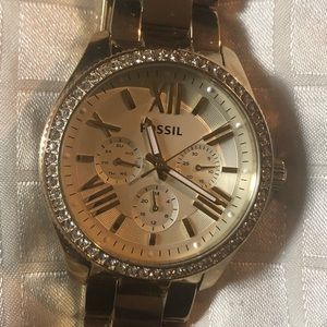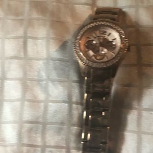 “” Multi -functional Champagne gold tone stainless steel case and bracelet. Fixed champagne gold tone bezel set with crystals. Champagne gold dial with rose gold tone hands and Swarovski crystal hour markings. 3 multi function sub dials displaying date, day of the week, and 24 hours. Excellent condition no scuffs or scratches. FREE SHIPPING!