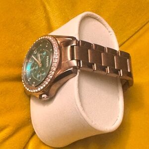The FOSSIL Riley ES3385 Women's Rose Gold Ladies Teal Multifunctional Dial Watch is a stylish and elegant wristwatch designed for women. Featuring a rose gold bezel and case, with a gem-set bezel type, this watch exudes a classic and timeless charm. The teal dial with Arabic numerals and stick indexes adds a touch of sophistication, while the multifunctional features like seconds hand, 12-hour dial, and day/date display make it practical for everyday wear. With a quartz movement and water resistance up to 100m, this watch is suitable for both dress/formal and casual occasions. The stainless steel bracelet and caseback with a screwback design ensure durability and quality.