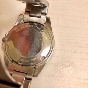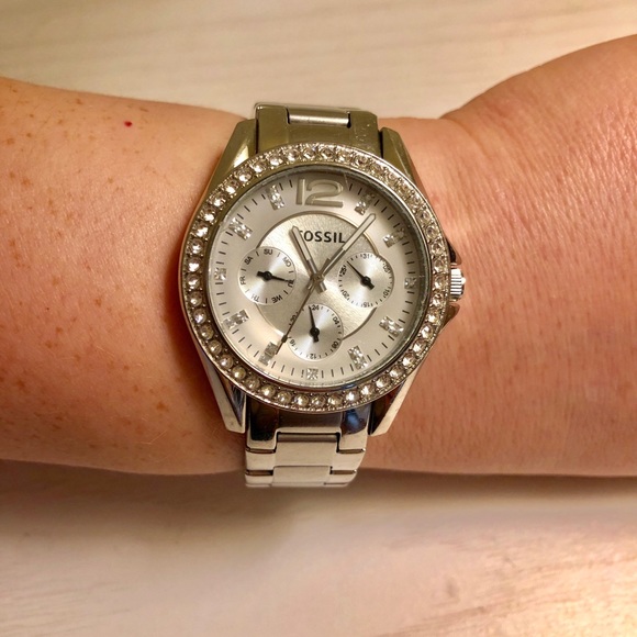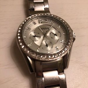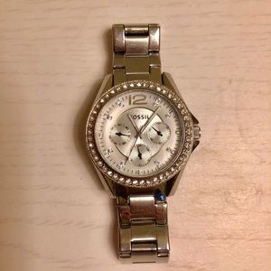 Fossil Riley chronograph rhinestone stainless steel watch. Clear stones around watch face and at hour marks. Mother of pearl watch face. Watch was lightly used; only minor scratches on silver steel. Pulls over wrist loose and secures with simple clasp.