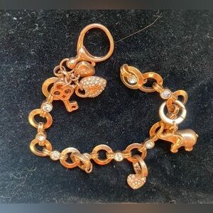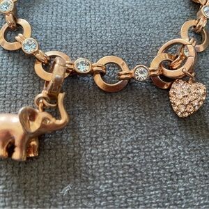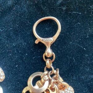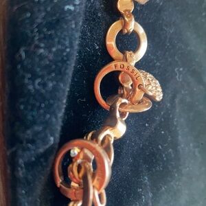 Fossil rose gold charm bracelet. This bracelet is so pretty and the charms are lovely. The heart charms have tiny rhinestones and there are rhinestones connecting the circle links. It looks like one charm is missing. 7.75” long and can easily be worn shorter by connecting to a different link.