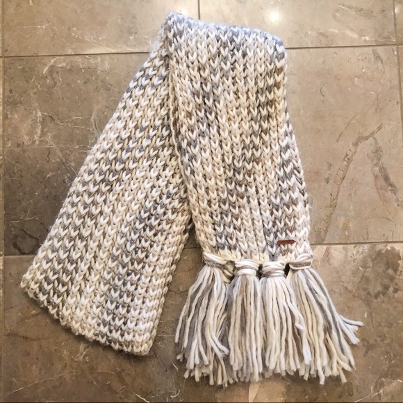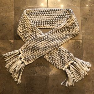 Fossil scarf in good used condition. It is made from white, taupe, and gray material. One side of the tag has come unattached, and it is shown in the pictures.