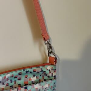 Fossil Seafoam Green/Coral/Purple/Taupe Canvas Crossbody Zip Purse 9.5x12x0.5”