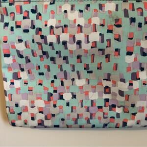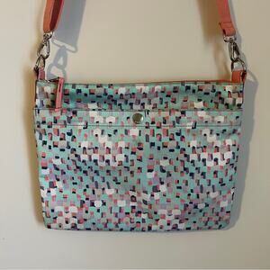 Seafoam green crossbody purse with taupe, coral, navy, and lavender design. Coral adjustable strap. Zipper closure on top. Zipper pocket on outside with two open pockets on inside. Some spots on interior and exterior but has been cleaned and sanitized. Otherwise in great condition! Also selling the matching wallet!