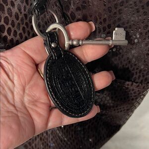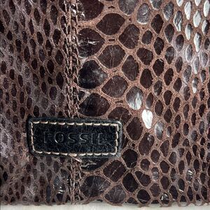 Fossil tote with a glossy brown finish. Features black handles and snakeskin design.