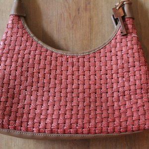 This basketweave Fossil purse is perfect for fall & would be the perfect complement to any autumn outfit. The main compartment has a zipper closure with leather pull & an inside zip pocket as well to keep items secure. Fossil wooden key fob attached to shoulder strap adds a nice finishing touch.