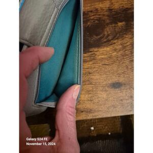 This is a great little wallet. It is a greyish blue in color. Overall it has light wear with no spots or holes. See photos for all details. This measures 7x3.5" Folded.---------------------------------------------------------------------P1