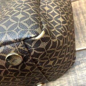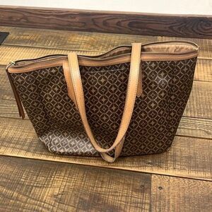 Fossil coated canvas and leather shopper tote bag. Signature brown print. Top zipper closure.