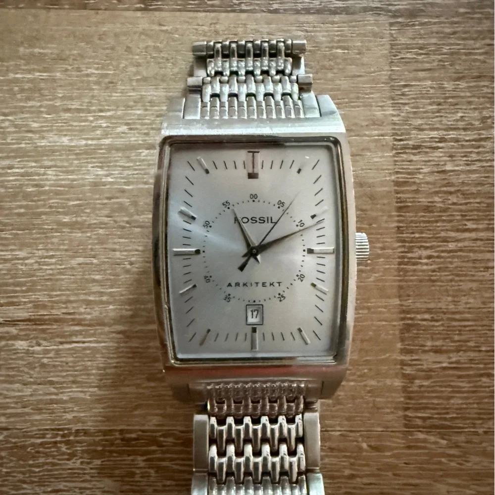 NEEDS BATTERY Elegant Fossil watch with a sleek silver dial. Features a classic metal band.