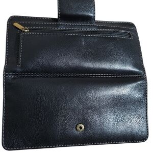 Fossil wallet 16 card slots. Snap closure zip pocket on the back.