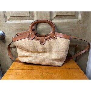 Fossil Straw Bag w Embroidered Flowers Leather Handle Trim