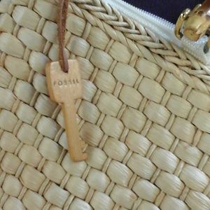 Cream and camel woven Fossil handbag in great condition. Beautiful bamboo handles and wooden carved fossil key chain. CLASSIC MEETS TREND. 14 xoxo 10. Handles 5" for easy satchel carrying.
