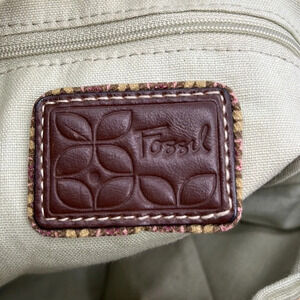 Fossil Striped Adjustable Strap Canvas & Leather Bag . Good pre-owned condition. Doesn't come with the wooden Fossil key and there is some cracking and peeling on the leather that holds the strap ring, shown in pics. Otherwise, it's in great shape, super clean. Actual strap is fabric webbing and is adjustable. 2 outer open top pockets, one large main compartment, one zipper compartment and 2 inner open top pockets, silver hardware. Approximate dimensions: 11 1/2" width, 1 1/2" depth, 12" height, 16" handle drop as shown in pics.