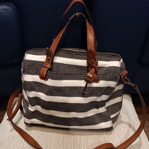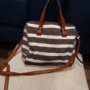 Stylish and versatile handbag featuring classic black and white stripes with elegant tan accents. Perfect for any occasion.