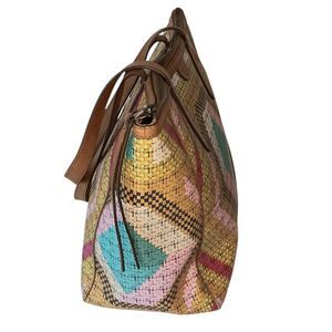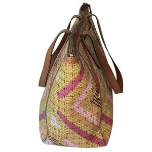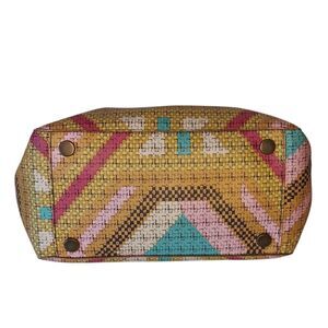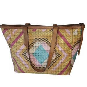 Fossil Sydney Canvas & Leather Tote Bag Multicolor Yellow Pink Blue Geometric