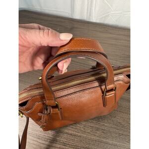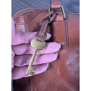 Elevate your everyday look with this timeless Fossil brown leather satchel crossbody bag. Crafted from high-quality pebbled genuine leather, this Fossil purse features dual top handles, an adjustable crossbody strap, and antique brass hardware for a sophisticated vintage-inspired design.