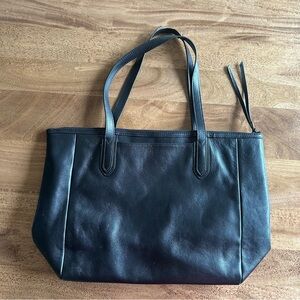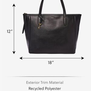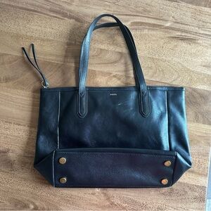 Sleek Fossil tote bag. Preowned condition, inside good condition. Some signs of wear on one handle and at the base of one strap. Small white scuff on front. Please see pictures of details. Key chain pictured on front not included on this bag. #Fossil #worktote #totebag