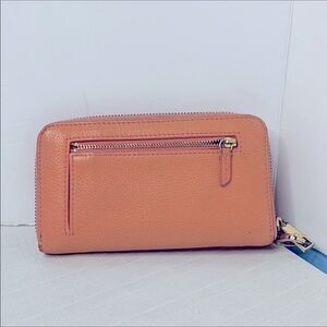 Phone size wallet featuring zip around entry with removable wristlet zipper pull and metallic logo detail in peach with gold tone hardware