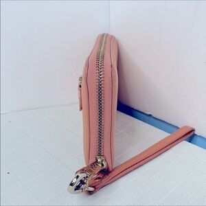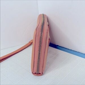 Phone size wallet featuring zip around entry with removable wristlet zipper pull and metallic logo detail in peach with gold tone hardware
