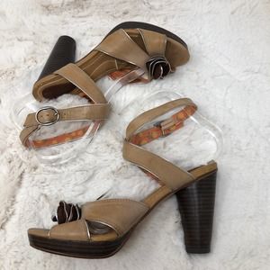 Fossil Tan Flower Platform Women 4"Heels 1" Platform Sz 8.5 Padded footbeds with flower on foot tops. Wrap ankle adjustable strap with silver buckle. Brown and silver upper. In Great Condition. Review all pictures for wear prior to purchase. Bin 6540
