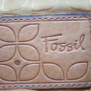 Fossil Tan Purse. This is in good used condition. There is a mark in the lining. The leather has a few marks, but it only adds to the patina. There are natural variations in the color of the leather. This purse has a zip top closure. Has an interior zip pocket and 2 slip pockets. The front has 2 good sized zip pockets. Measurements are approximate. Measurement are: Width 13 inches, Height 11 inches, Depth 3.5 inches, Strap drop is 18 inches, adjustable. Smoke-free and pet-friendly.