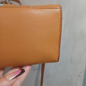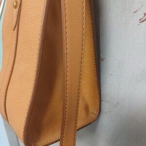 Stylish Fossil satchel in tan. Features bold stripes in pink, white, blue, and brown. Perfect for everyday use.