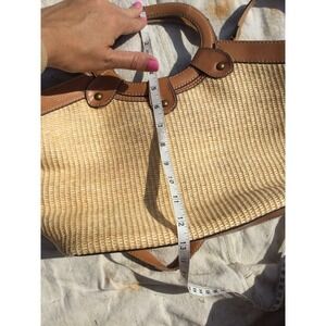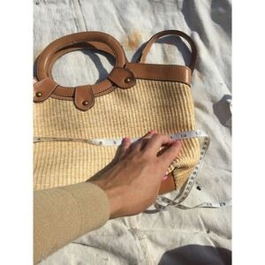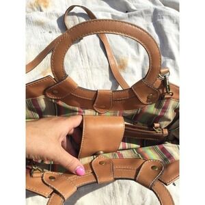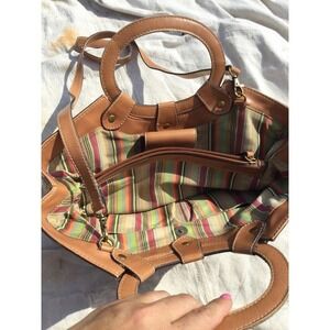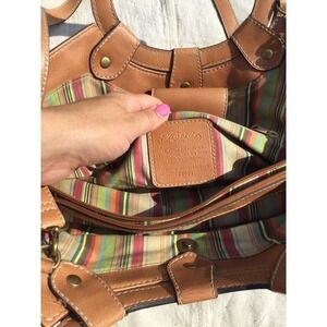 Stylish Fossil tote with floral embroidery. Features tan and brown colors. Perfect for casual outings.