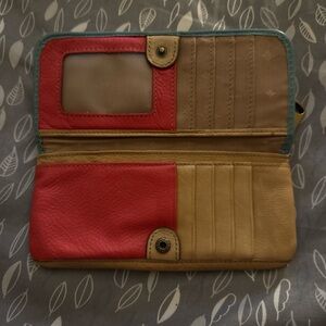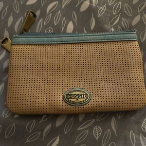 Stylish Fossil wallet with red polka dots. Tan base with blue trim. Compact and chic design.