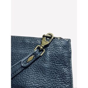 Super great leather wristlet detachable rest strap front slip pocket top zip closure credit card slots in the interior and signature logo