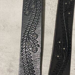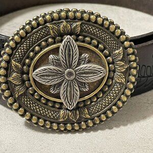 Fossil Tooled Brown Leather Waist Belt Two Tone Oval Floral Buckle Women's Large