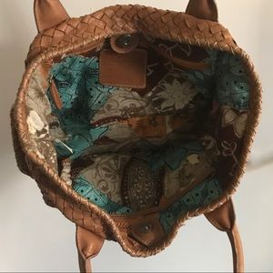 Light brown Leather tote bag. Crisscrossing pattern. Over the shoulder straps. Three pockets inside. Light wear and tear- almost new!