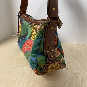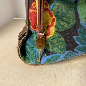 Fossil Tropical Floral Fabric Purse • Brown Leather Strap • With Key