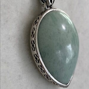 This minimalist necklace showcases a captivating mint green turquoise teardrop stone, elegantly suspended from a silver chain. The smooth, polished cabochon pendant is the centerpiece, offering a modern and sophisticated touch to any ensemble.
