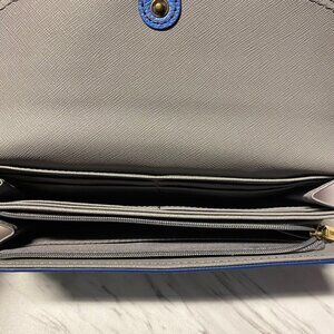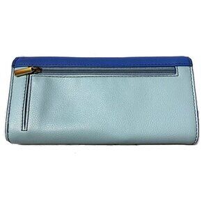 This lovely blue colorblocked leather wallet has gold fittings, a back zip coin pocket, a front flap snap opening that opens to a gray faux leather interior that includes 2 open compartments, a zip currency area, and 14 credit card slots. The wallet is great condition.