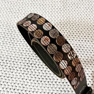 No size markings but will fit a size medium or large. See measurements as a guide for best fit. Black leather bronze metallic medallion matte geometric belt. Silver buckle closure. Preowned in good condition with no stains or tears.