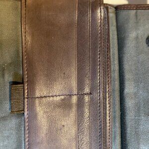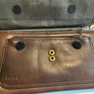 Vintage Fossil brown leather multifunction trifold wallet / crossbody bag with detachable strap for use as a clutch organizer.