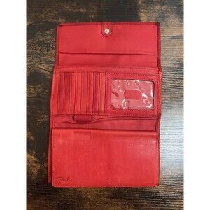 Vintage Fossil compact trifold wallet in genuine red leather with snap closure. This piece has seen lots of love and shows obvious stains and wear, but still has some life left. Please review all photos carefully prior to purchase. Sold as is.