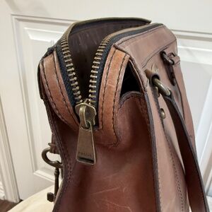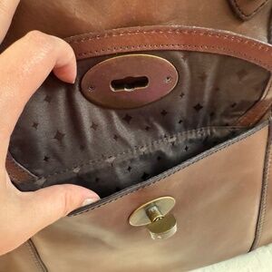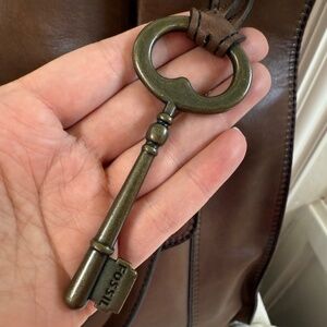Heavy brass hardware and turn lock on front pocket. Features classic Fossil key charm. Interior is very clean and features 4 slip pockets, 2 pen slots, and 1 zipper pocket. Zipper top closure has a hidden magnet on one end to allow you to open the tote extra wide making it easy to get your belongings in and out of. Brass metal feet to protect bottom of bag.