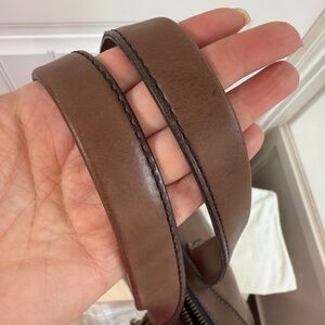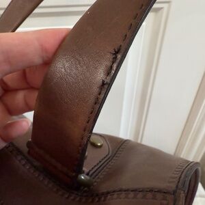 Beautiful large leather tote in a rich chocolate color. Excellent preowned condition. Purchased at Dillard's in 2011, used for 2 weeks then stored stuffed for shape in dust bag since. Leather is very sturdy and has some natural patina to it. Some scuffs on inner handles from where it rubbed on the zipper.